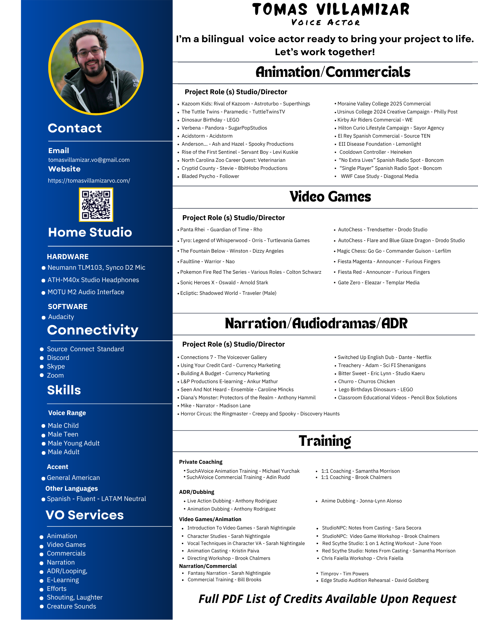 Tomas Villamizar is a bilingual Latino male voice actor with a lifelong love for video games and storytelling. Growing up captivated by the immersive worlds of his favorite games and animated shows, he discovered that voice acting was the perfect way to channel his creativity and become part of the stories he admired.